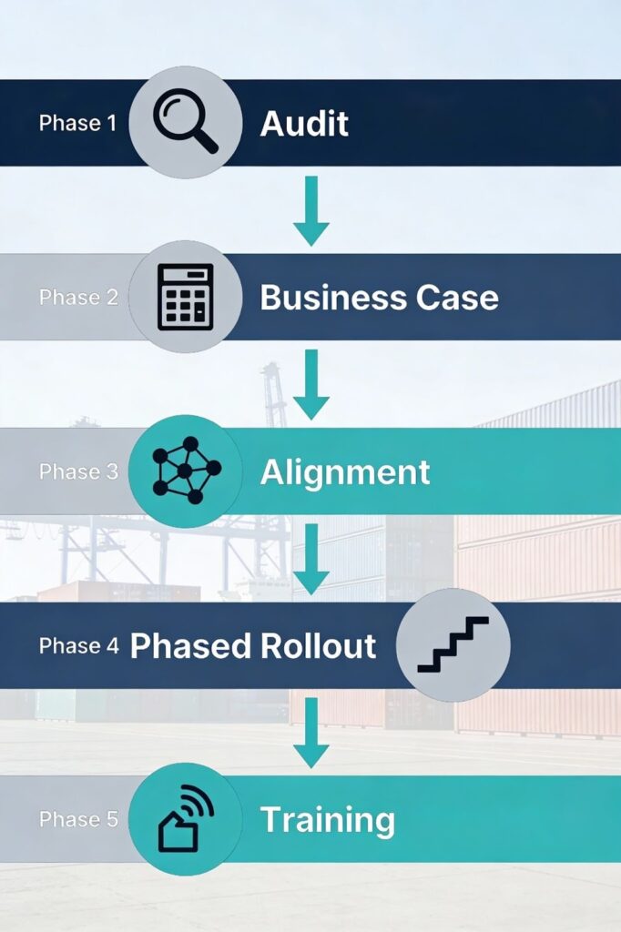 Step 4: Phased Roadmap. Start with a pilot module, order management for container operations or inventory visibility. Prove value quickly, then expand to adjacent modules.