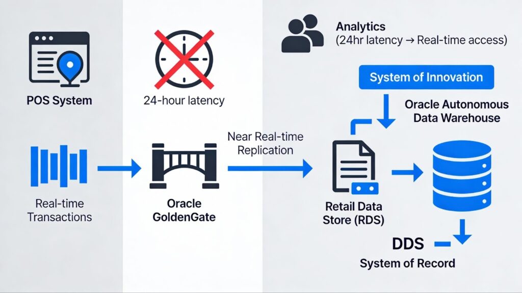 This latency problem disappears with proper data engineering retail architecture. The Retail Data Store (RDS) solves this by separating the “system of record” from the “system of innovation.” Oracle GoldenGate replicates data from operational applications like Merchandising Foundation Cloud Service into the RDS on an Oracle Autonomous Data Warehouse in near real-time.