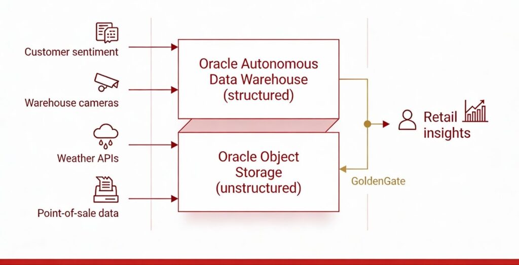 The Oracle Data Lakehouse bridges this gap by combining Oracle Autonomous Data Warehouse for high-performance structured queries with Oracle Object Storage for raw unstructured data. When inventory arrives at a warehouse, that structured transaction flows via GoldenGate. Simultaneously, warehouse sensor logs and customer feedback arrive separately. SQL queries can join them seamlessly because the architecture treats both as native sources.