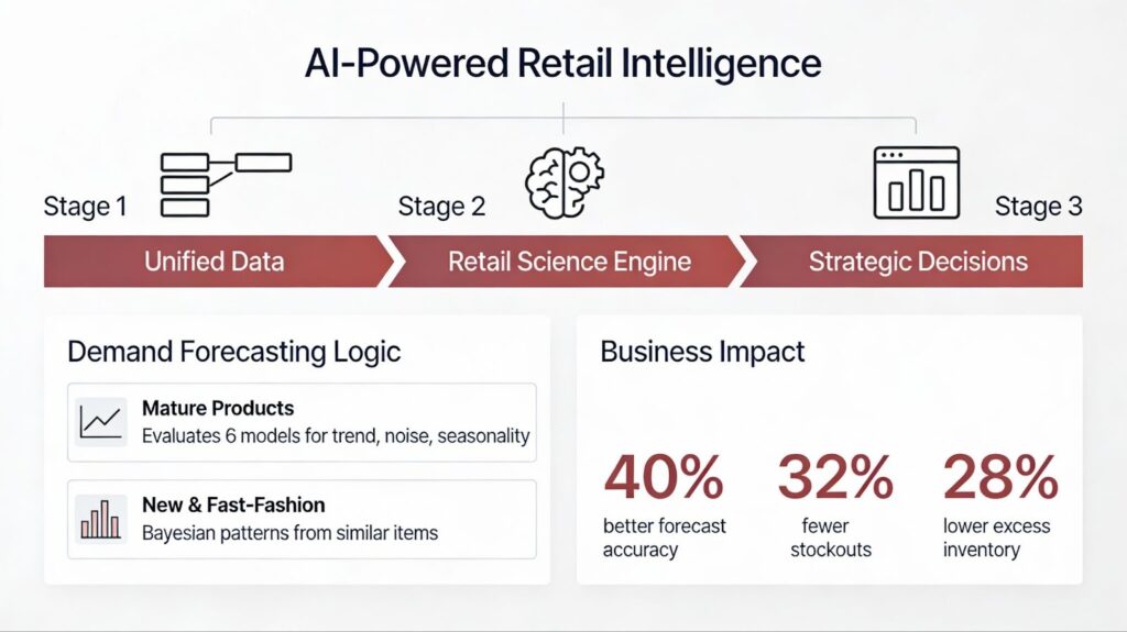 Retailers implementing these AI retail experience approaches see tangible results. Organizations with advanced demand forecasting achieve 40% accuracy improvements compared to traditional methods, reducing stockouts by 32% and excess inventory costs by 28%. These aren’t theoretical improvements; they translate directly to cash flow and customer satisfaction.